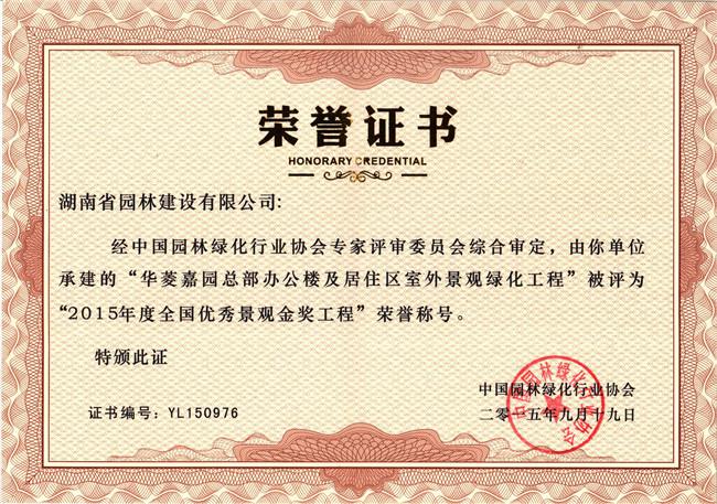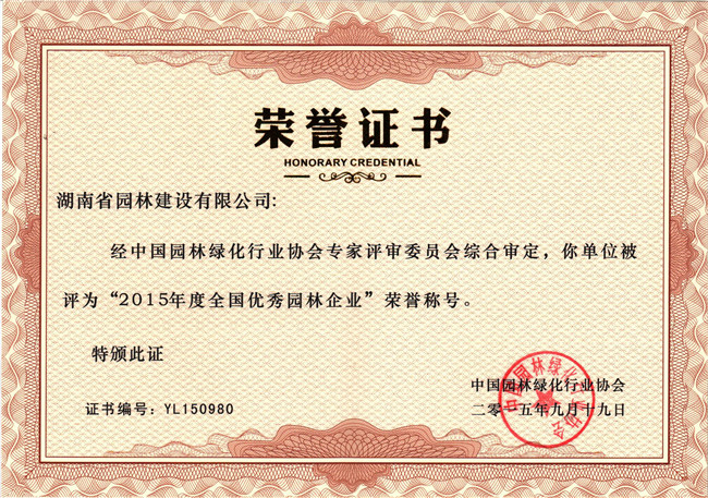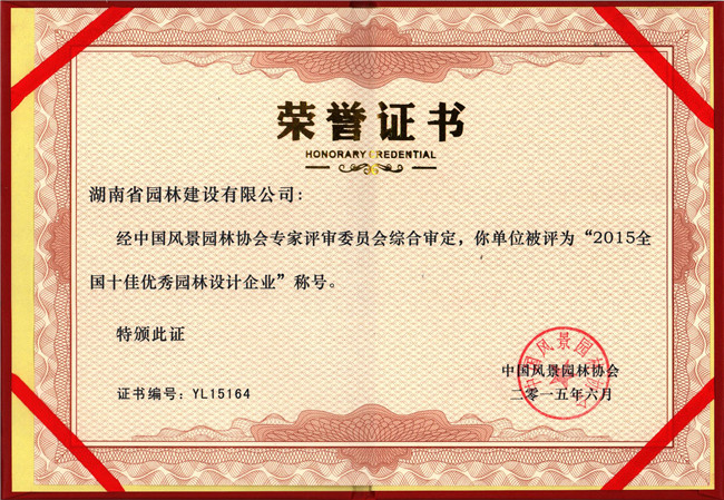 2015全国十佳优秀园林设计企业荣誉证书